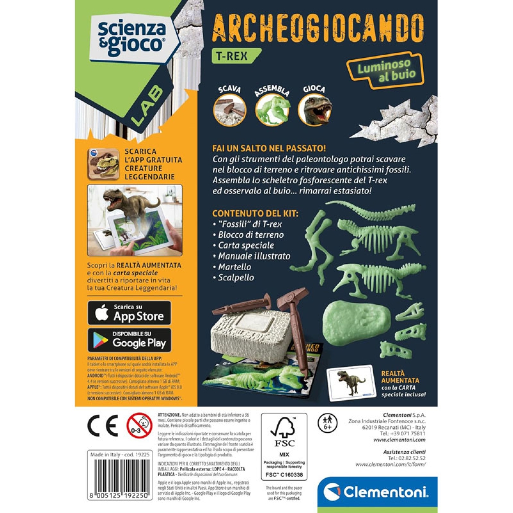 Il mondo dei dinosauri non è mai stato così divertente con questo gioco scientifico per veri paleontologi! KIT FOSSILI: Scava il mattone e scopri lo scheletro fosforescente del leggendario T-Rex! APP REALT AUMENTATA: Rivivi il passato grazie alla realtà aumentata! Con l'app gratuita basta inquadrare con tablet o smartphone le carte contenute nel kit per far rivivere la leggendaria creatura. Divertiti a scattare foto e personalizzarle, gira tanti video e condividili! La confezione contiene martello, scalpello e un mattone da scavare, per diventare un vero paleontologo. CARATTERISTICHE: Un gioco scientifico per far avvicinare i piccoli alla paleontologia in modo facile e divertente! Consigliato per i bambini sopra i 6 anni. Progettato e realizzato in Italia.