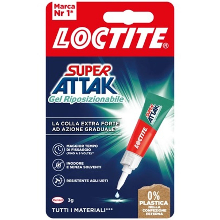 LOCTITE Super Attak Riposizionabile è un adesivo cianoacrilato monocomponente in formulazione gel indicato per uso domestico, crea forti incollaggi tra materiali come plastica, gomma, metallo, legno, ceramica, cuoio, carta e cartone. Ha un odore leggero e a presa più lenta rispetto al normale Super Attak, il che lo rende facilmente riposizionabile, (richiede almeno il doppio del tempo rispetto il normale LOCTITE Super Attak).