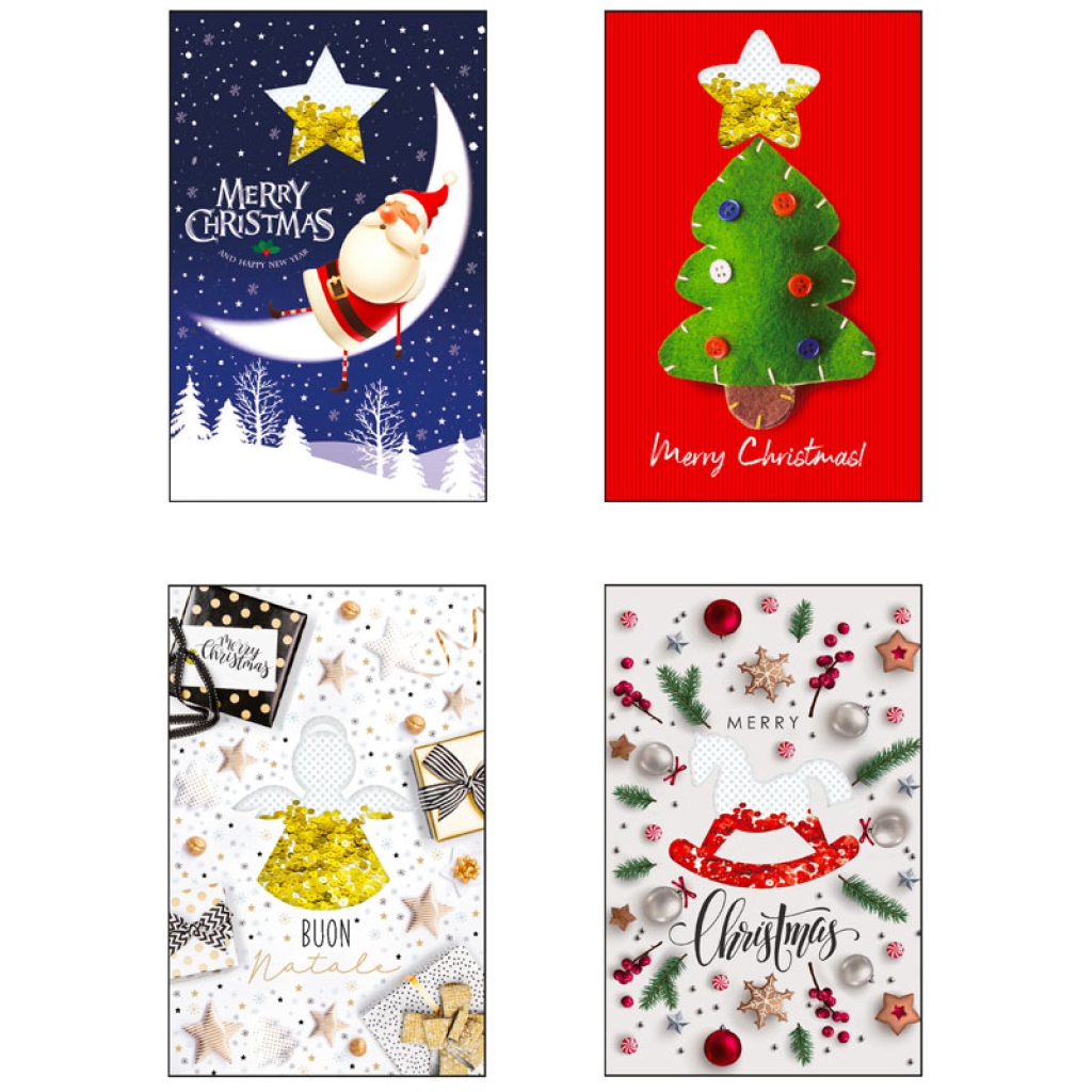 BIGLIETTI XMAS 11,5X17CM 12PZ C/PAILLETTES: vendita all’ingrosso a prezzi competitivi con consegna veloce by Bocchio srl