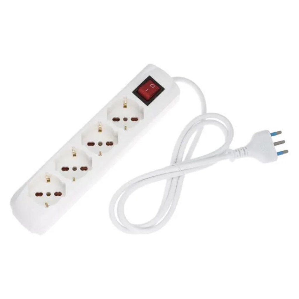 Presa Multipla 4 Posti UNIVERSAL , 4 Prese 16A 2P+T+T 250V (P30) e 16A 2P+T 250V Bivalente (P17/11), Cavo di alimentazione 1,5 m incluso H05VV-F 3X1mm , Interruttore luminoso Rosso ON/OFF, Confezione Busta con cartoncino.
