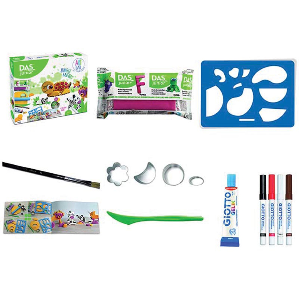 Contenuto: 3 panetti Das Junior Art Lab, 4 taglini, 1 stencil, 1 mattarello, 1 coltellino, 4 pennarelli Decor Materials, 1 pennarello, 1 colla Giotto Gelik e 1 guida illustrata.