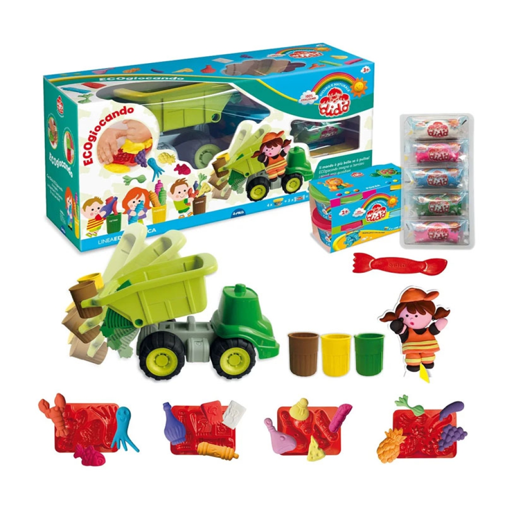 Il riciclo con Didò diventa un gioco. Modella la spazzatura con i 650g di pasta didò e le formine, differenziale nei bidoncini colorati e si trasportali con il camioncino a ribalta. Con Didò Ecogiocando anche i piccoli di casa imparano a prendersi cura dell ambiente. Contenuto: 5 salsicciotti da 50g, 4 barattoli da 100g, 1 camioncino, 3 bidoncini, 4 formine, 1 coltellino e 1 mattarello, 1 foglio con oggetti pre-fustellati, 1 scatola cassonetto.