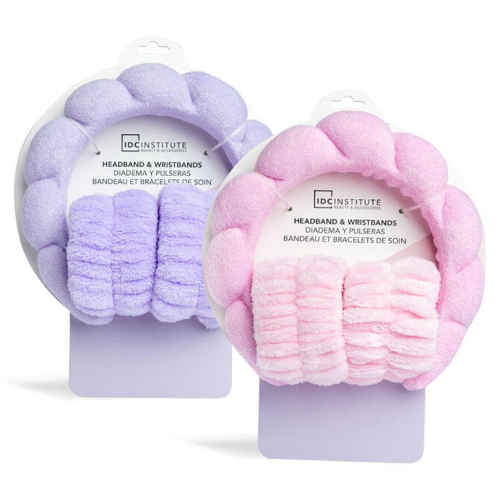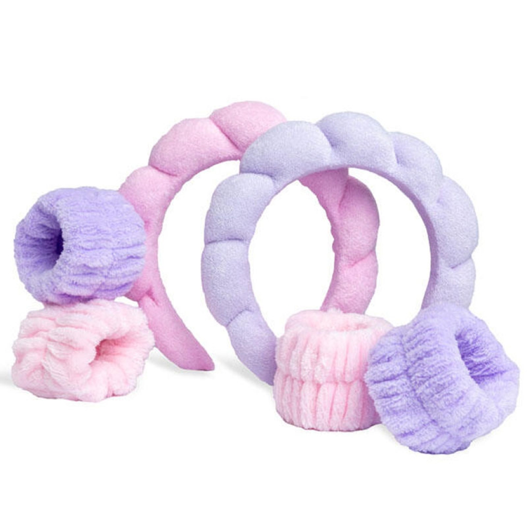 Migliora la beauty routine con la fascia disponibile in graziose tonalità rosa e viola, perfetta per aggiungere un tocco di stile e tenere i capelli sotto controllo durante la tua routine di bellezza. E non dimenticare i polsini, indispensabili per proteggerti dall'acqua e rendere la tua routine di cura della pelle un gioco da ragazzi.
