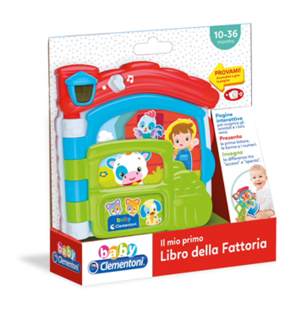Un libro educativo elettronico parlante per imparare in compagnia degli animali della fattoria! Girando le pagine e premendo il tasto luminoso sul tetto della fattoria, il bambino potrà conoscere gli animali e i loro versi, scoprire le prime lettere, i numeri e le forme. Un libro ricco di suoni divertenti, canzoni e disegni colorati in tema fattoria. Il tasto luminoso insegna anche a distinguere la differenza tra acceso e spento. Stimola lo sviluppo del linguaggio, la comprensione della relazione causa-effetto, la manualità e la percezione visivo-uditiva. 10-36 mesi