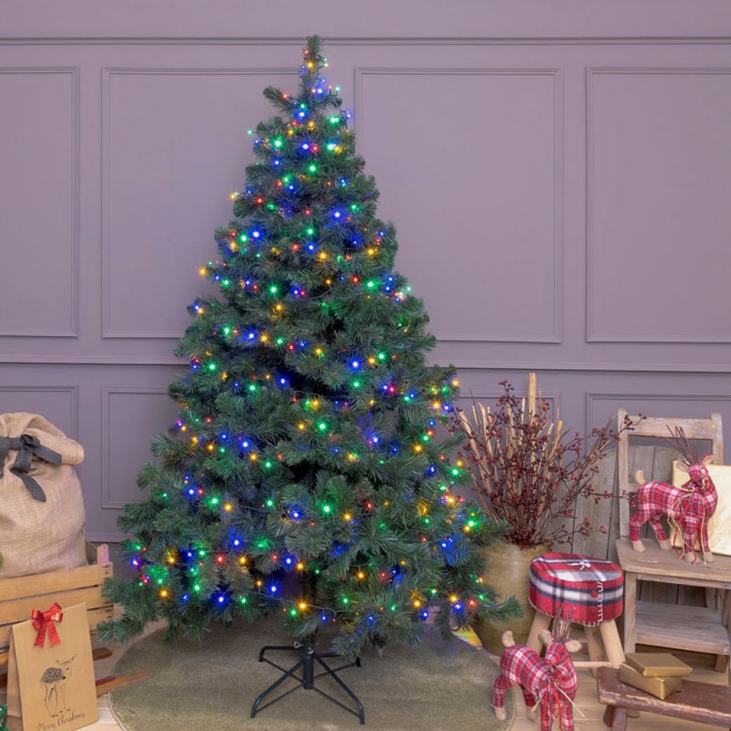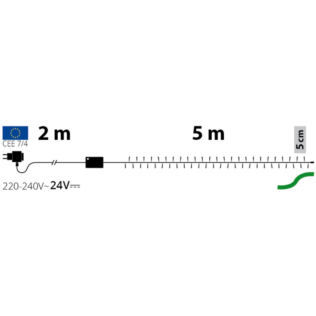 Catena lineare TLE 100 LED MULTICOLOR diam.5mm Reflex, Timer Memory Controller 8 giochi di luce selezionabili con Timer On-Off 8-16 ore disinseribile tramite Pulsante Luminoso, Trasformatore Bassa Tensione, uso Esterno, Cavo Verde, Dimensioni 2+5m.