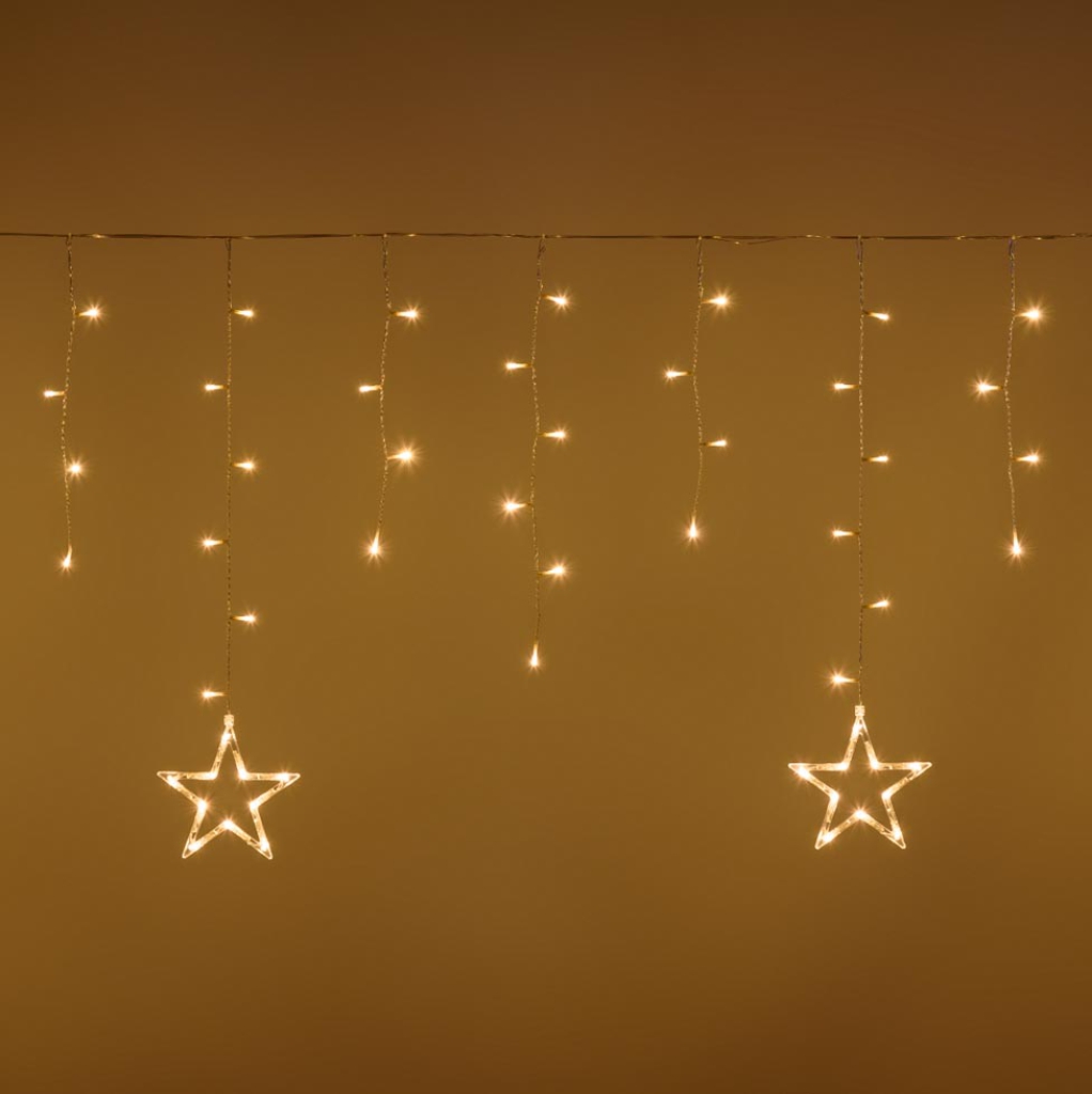 Ice Light 400xH80cm con 5 Stelle 150 LED BIANCO CALDO diam.5mm Reflex, Prolungabile (Max 2 pz / 300 led / 8m), Memory Controller 8 giochi di luce selezionabili con Timer 8 ore On 16 ore Off disinseribile tramite Pulsante Luminoso integrato nel Trasformatore Bassa Tensione di Sicurezza, 31V Smart Connect compatibile, IP44 uso Esterno e Interno, Cavo Trasparente, Cavo di Alimentazione 4m, Dimensioni 400xH80cm.