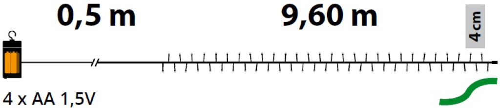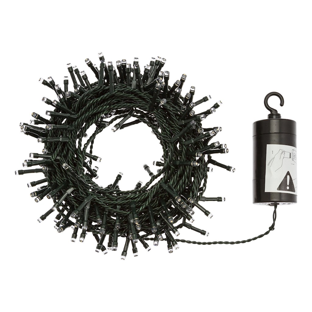 Catena lineare TL 240 LED MULTICOLOR diam.5mm Reflex, Memory Controller integrato nel Porta Batterie Luce Fissa + 7 giochi di luce selezionabili + Off, Timer On-Off 8-16 ore, a Batteria 4xAA 1,5V, uso Esterno, Cavo Verde, Dimensioni 0,5+9,6m.
