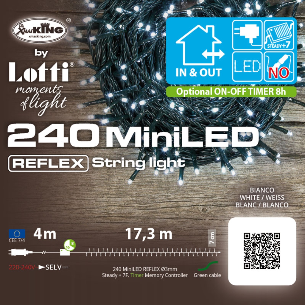 Catena lineare TLG 240 MiniLED BIANCO 3mm Reflex, Timer Memory Controller 8 giochi di luce selezionabili con Timer On-Off 8-16 ore disinseribile tramite Pulsante Luminoso, uso Esterno, Cavo Verde, Dimensioni 4+17,3m, Scatola lusso color.