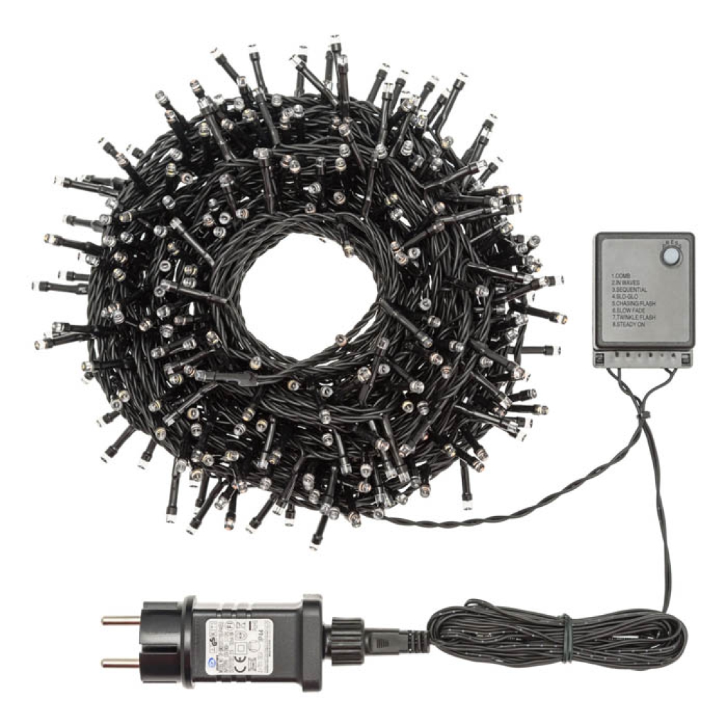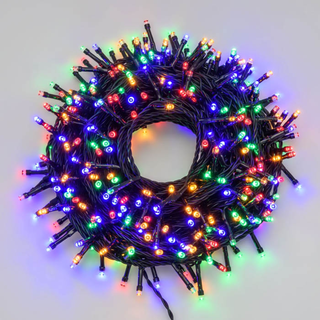 Catena lineare TLH 300 LED SuperBright MULTICOLOR diam.5mm Reflex, Timer Memory Controller 8 giochi di luce selezionabili con Timer On-Off 6-18 ore disinseribile tramite Pulsante Luminoso, Trasformatore 31V, uso Esterno, Cavo Soft Nero, Cavo di Alimentazione 4m, Dimensioni 4+21,5m.
