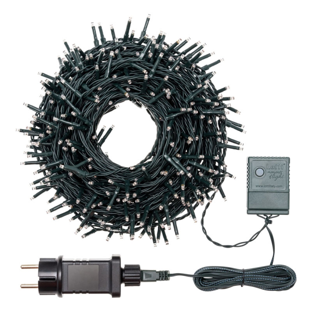 Catena lineare TLG 360 MiniLED VERDE diam.3mm Reflex, Timer Memory Controller 8 giochi di luce selezionabili con Timer On-Off 8-16 ore disinseribile tramite Pulsante Luminoso, Trasformatore Bassa Tensione, uso Esterno, Cavo Verde, Dimensioni 4+25,7m.