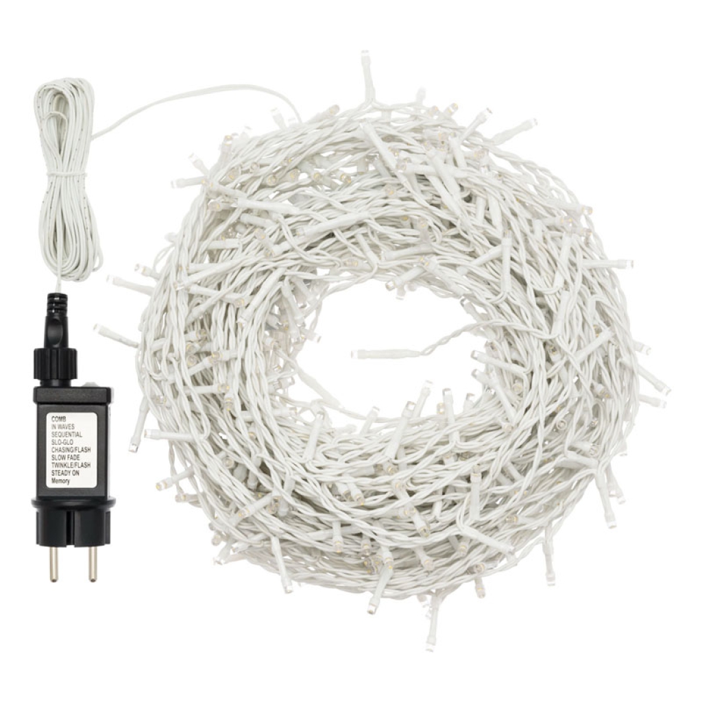 Tenda 500xH100cm 500 LED BIANCO CALDO 5mm, Timer Memory Controller integrato nel Trasformatore Luce Fissa + 7 giochi di luce selezionabili con Timer On-Off 8-16 ore disinseribile tramite Pulsante Luminoso, Trasformatore Bassa Tensione di Sicurezza, IP44 uso Esterno e Interno, Cavo Soft Bianco, dotata di robusti supporti per appenderla, Cavo di Alimentazione 4m, Dimensioni 500xH100cm.