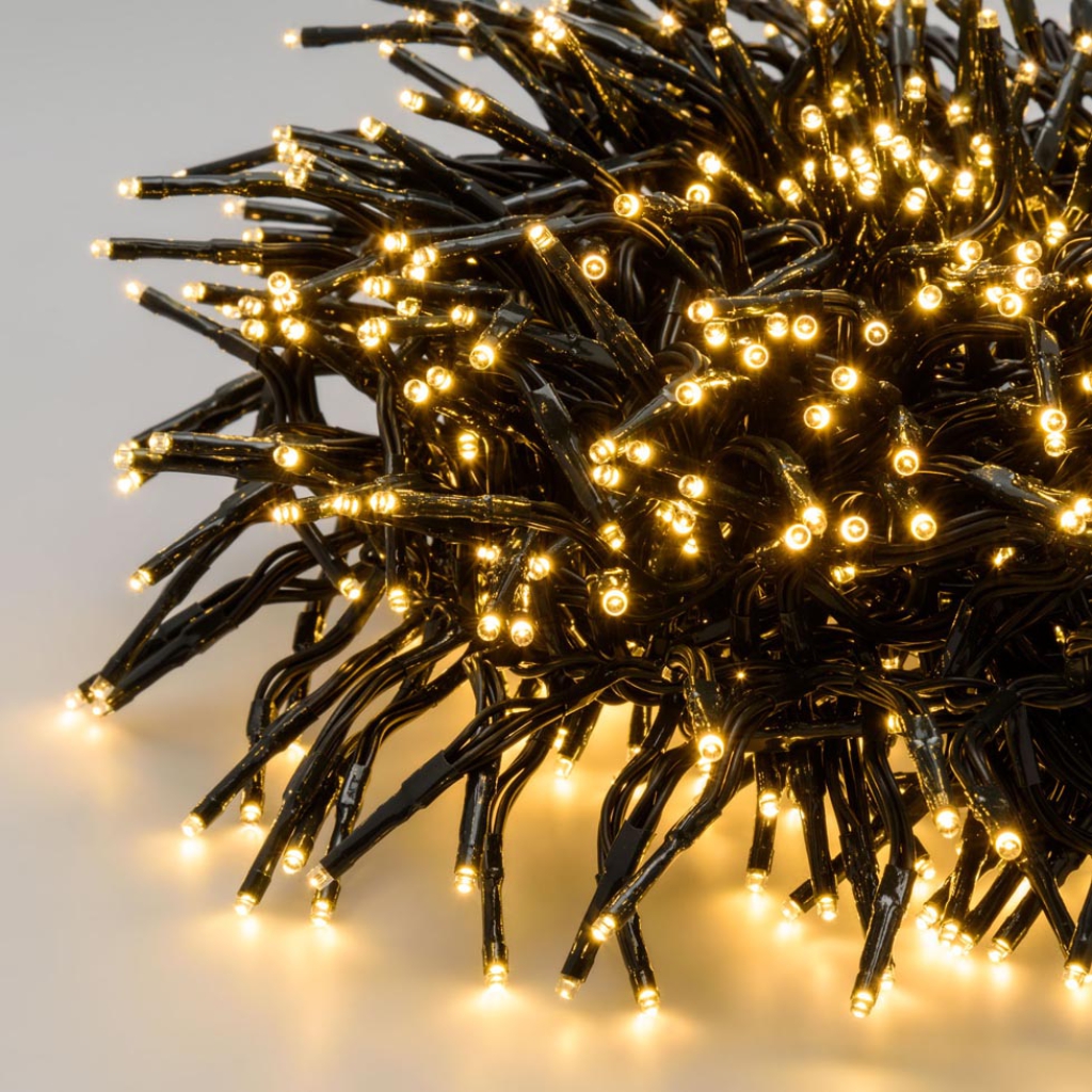 Catena lineare Festone Cluster diam.12cm FSLG 750 MiniLED BIANCO CALDO diam.3mm Reflex, Luce Fissa, Trasformatore 30V, uso Esterno, Cavo Verde, Dimensioni 4+7,5m.