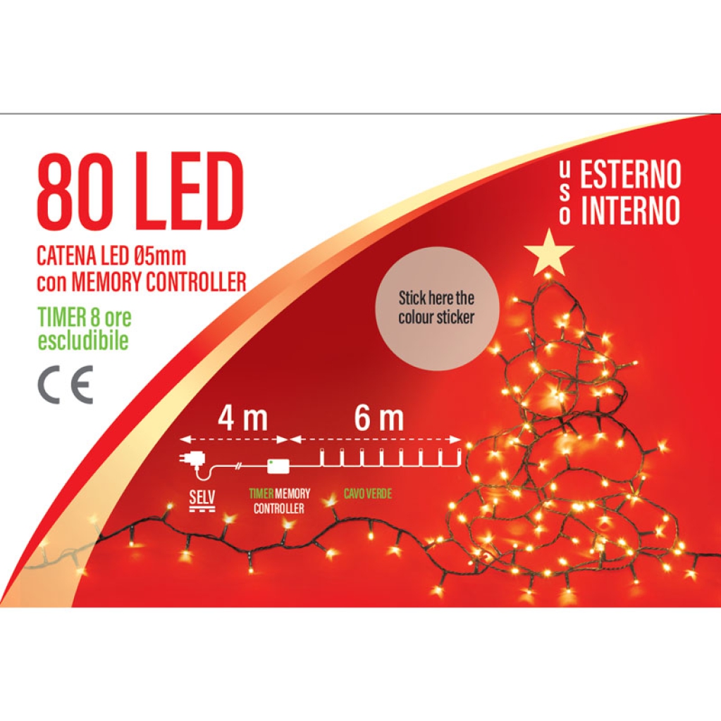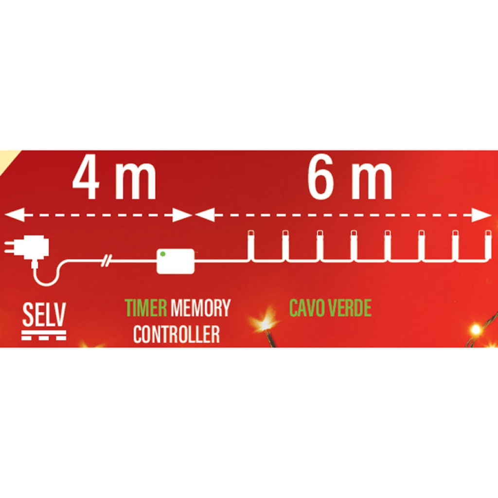 Catena lineare TL24V 80 LED BIANCO 5mm Reflex, Timer Memory Controller 8 giochi di luce selezionabili con Timer On-Off 8-16 ore disinseribile tramite Pulsante Luminoso, Trasformatore Bassa Tensione, uso Esterno, Cavo Verde, Dimensioni 4+6m, Scatola lusso color.