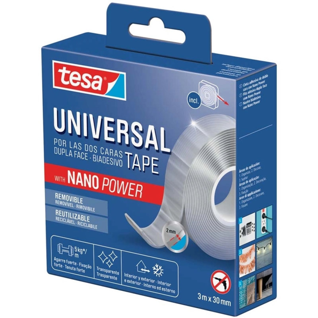 Tesa universal nanotape è il nastro biadesivo trasparente, forte e versatile, ideale per fissare, decorare e organizzare senza l uso di chiodi o viti. Grazie alla sua elevata forza adesiva, può sostenere fino a 5 kg per metro, restando quasi invisibile. si applica facilmente su superfici lisce e solide, è riutilizzabile, lavabile e rimovibile senza lasciare residui. Il pratico dispenser rende veloce e preciso lo srotolamento. Perfetto per casa, ufficio, auto e camper, questo nastro biadesivo nanotecnologico è una soluzione affidabile, discreta ed ecologica per tutte le esigenze di fissaggio.
