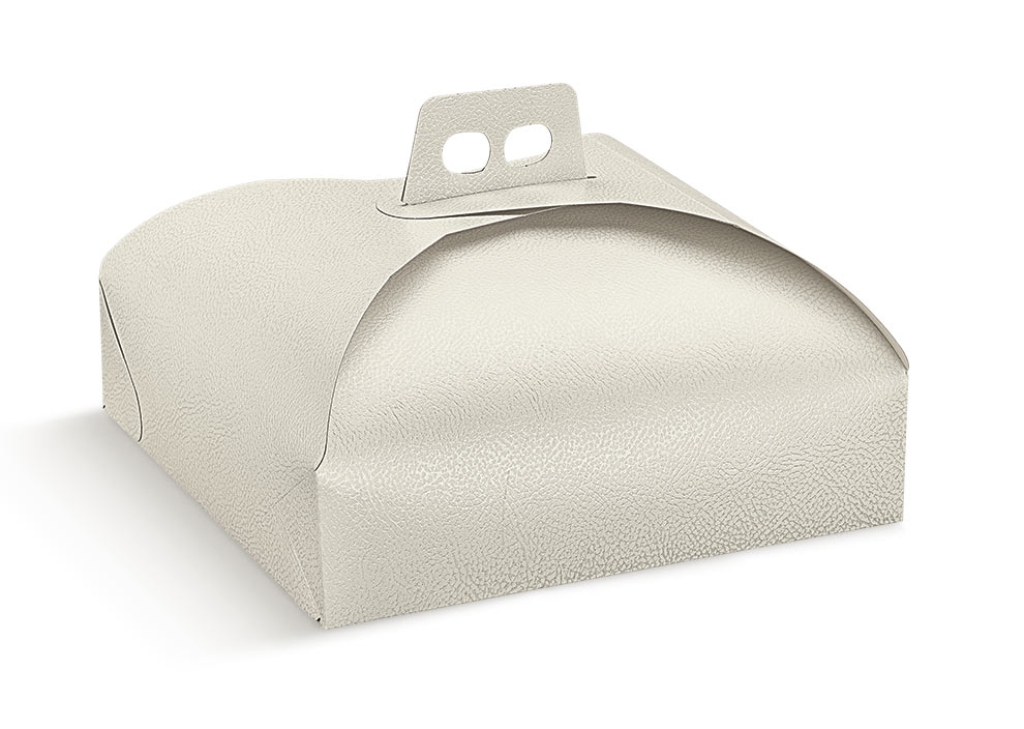 Scatola con maniglia in cartoncino teso per contenere una torta, prodotti dolciari.