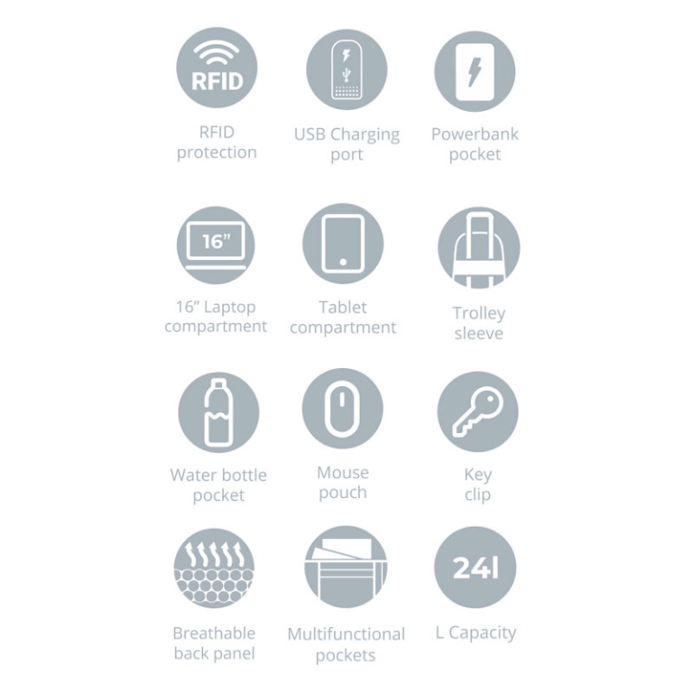 Caratteristiche principali: Porta di ricarica USB intelligente brevettata con design del cavo integrato. Tasca di protezione RFID. Il manicotto del trolley si adatta alla maniglia del bagaglio verticale per lasciare le mani libere. Lo scomparto imbottito per il laptop è progettato per adattarsi a qualsiasi laptop o tablet di dimensioni fino a 16 . Scomparto imbottito per tablet. Progettato per adattarsi a qualsiasi tablet di dimensioni fino a 9,75 . Tasca dedicata per powerbank. Custodia per mouse dedicata. Tasca dedicata alla bottiglia d acqua. Clip per chiavi dedicata. Tasche multifunzionali. Il pannello posteriore traspirante dello zaino presenta un'imbottitura in rete per una comoda ventilazione dell'aria. Dimensioni 43x30x16cm. Peso 980gr. Volume totale 24 litri.